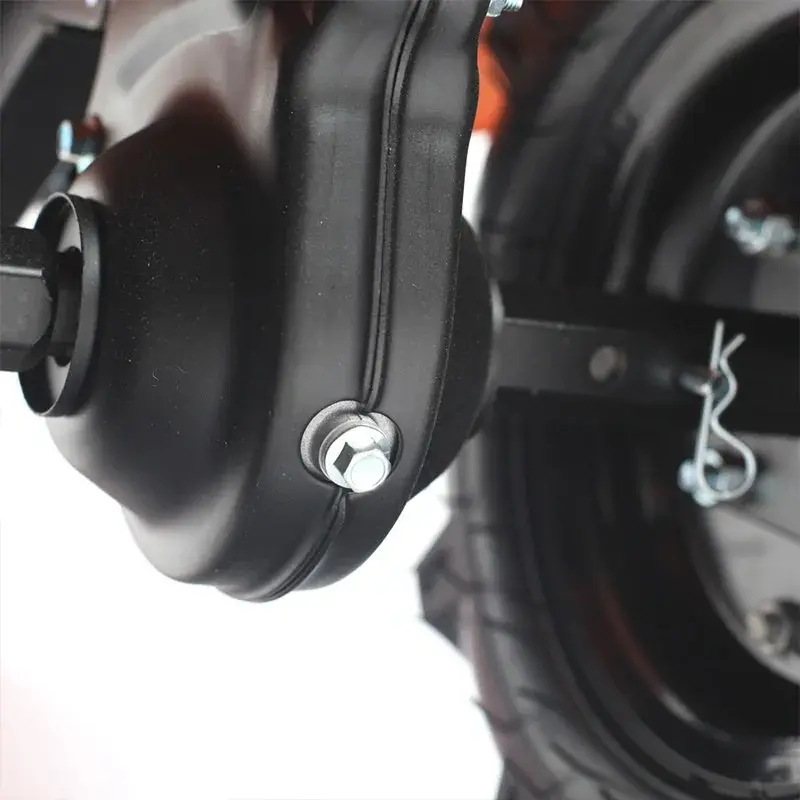 Для защиты от брызг и грязи, вылетающей из-под колес у мотоблока по бокам корпуса есть специальные крылья. Спереди у модели располагается прочный изогнутый бампер, который надежно предохраняет аппарат от механических повреждений.