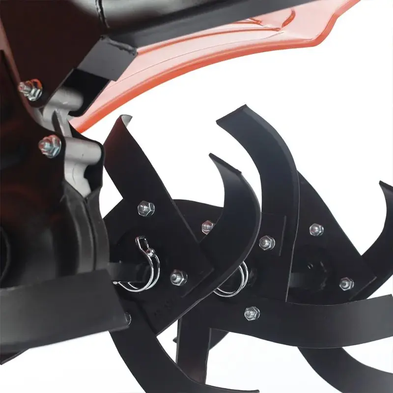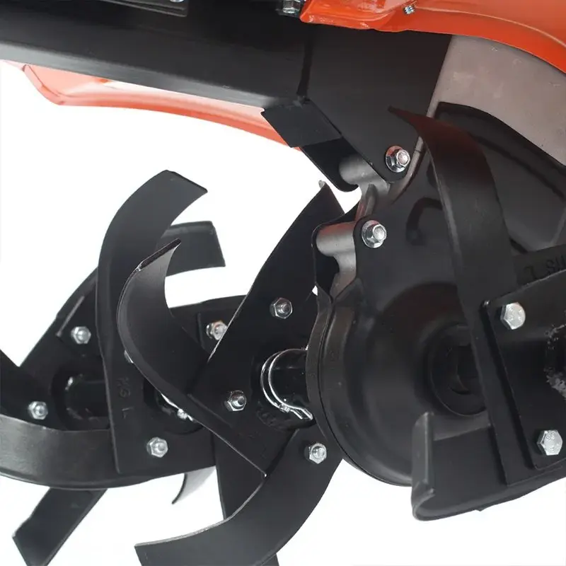 На бензиновый мотоблок установлен цепной алюминиевый редуктор. Это защищает механизм от возникновения коррозии. Для комфортного движения на выбор есть 4 передние скорости и 2 задние. Реверс пригодится, если культиватор застрял в земле или для разворота в условиях ограниченного пространства.
