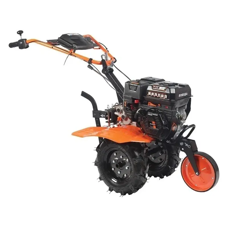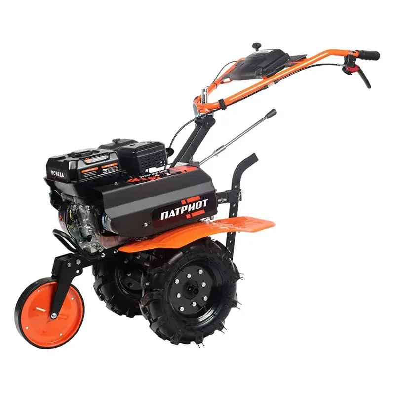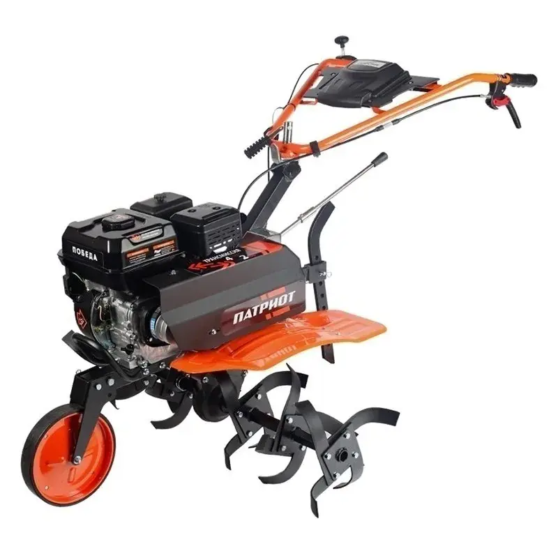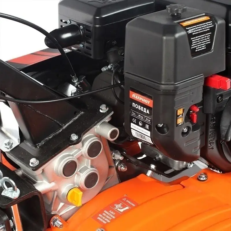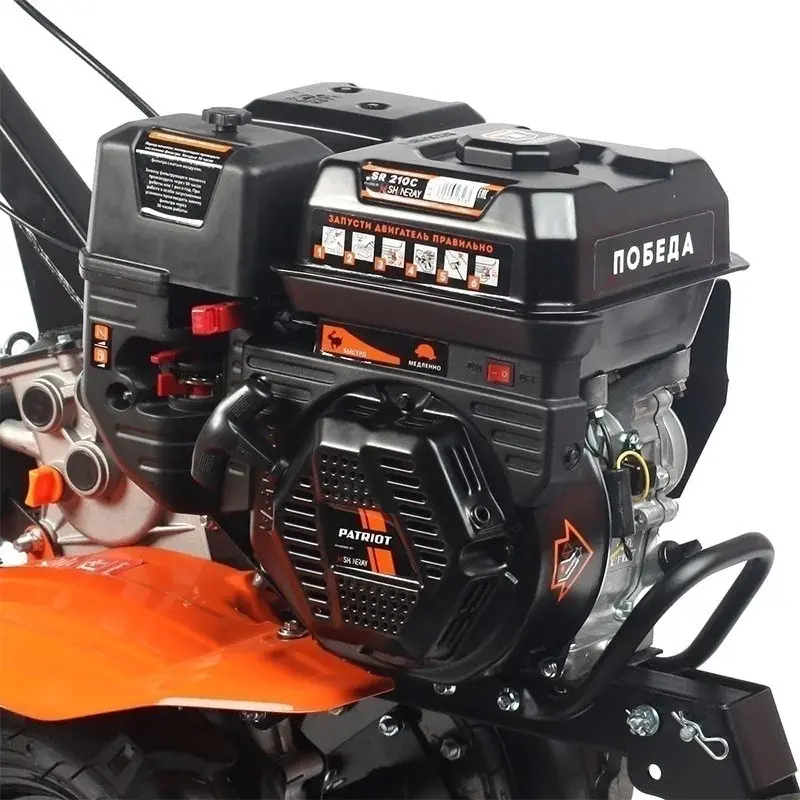 Мотоблок Patriot Победа работает от бензинового 4-тактного мотора мощностью 7 л.с. Ширина обработки у модели составляет 90 см, а глубина культивации - от 16 до 30 см, в зависимости от того, как установлен сошник. Бензиновый мотоблок может работать как с фрезами, так и с дополнительным навесным оборудованием.