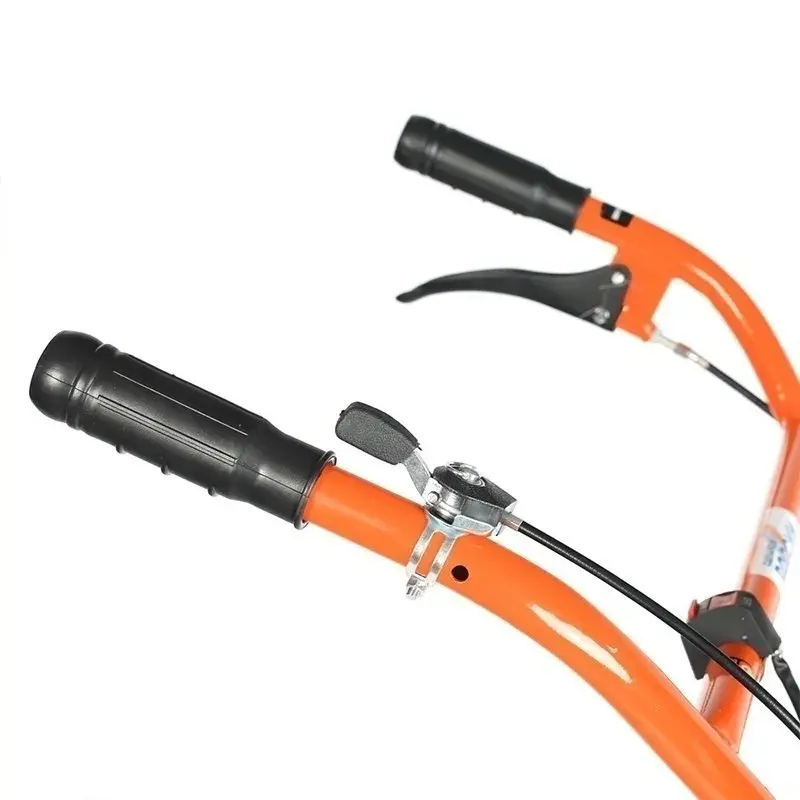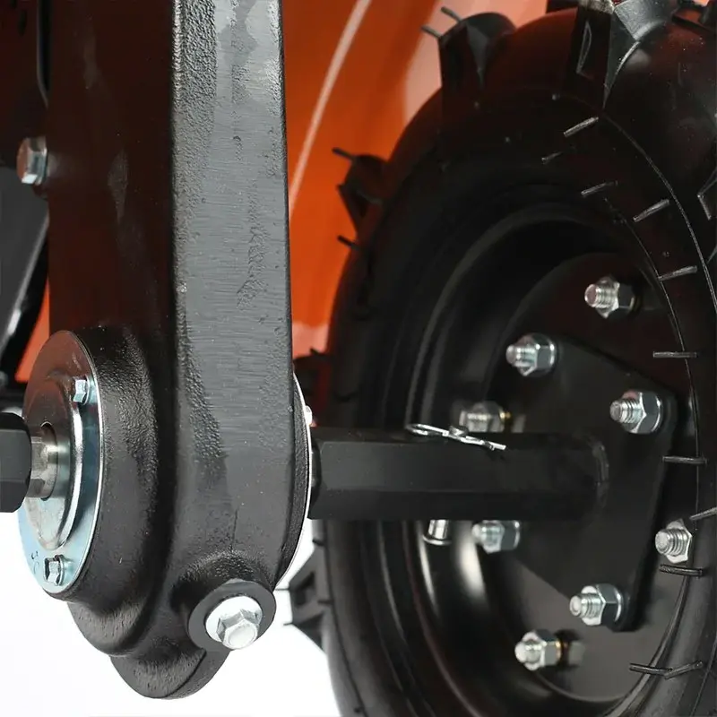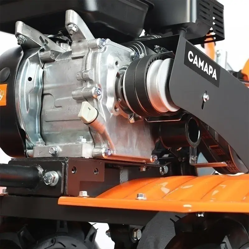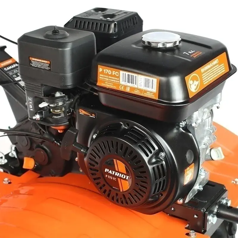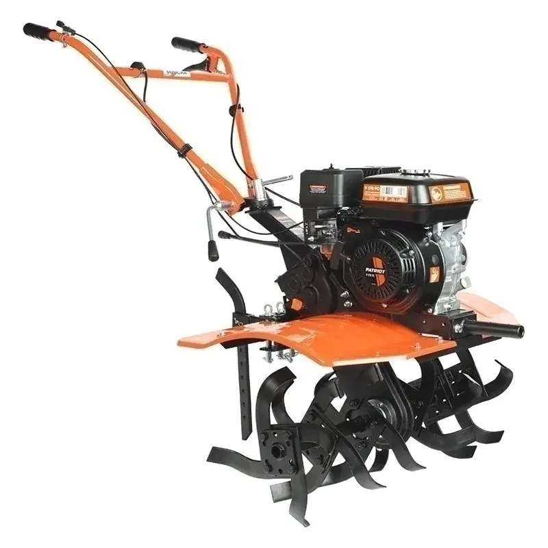 Мощный мотоблок с большой шириной захвата и чугунным редуктором, укомплектован закаленными фрезами, что позволяет применять его на тяжелых грунтах и для обработки целины. Наличие в комплекте пневматических колес позволяет использовать совместно с тележкой. Есть возможность установки косилки.