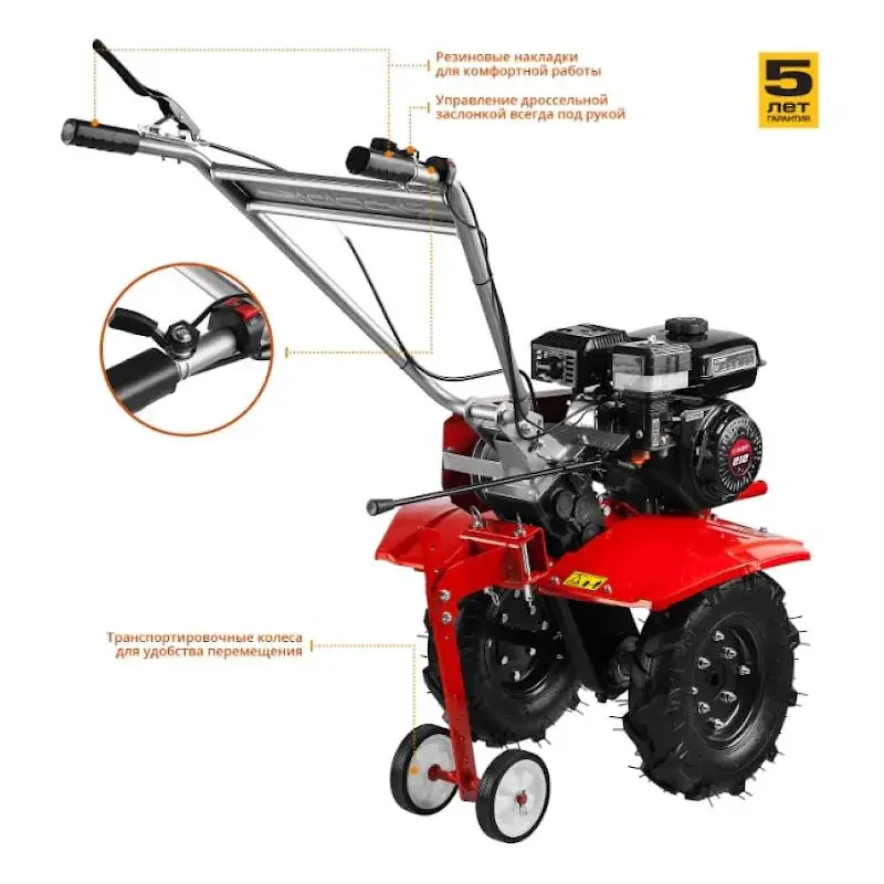 Отдельно можно приобрести плуг, снегоочиститель, щетку, лопату, фронтальную косилку, тележку и другое оборудование. Аксессуары крепятся к мотоблоку и расширяют его функционал.