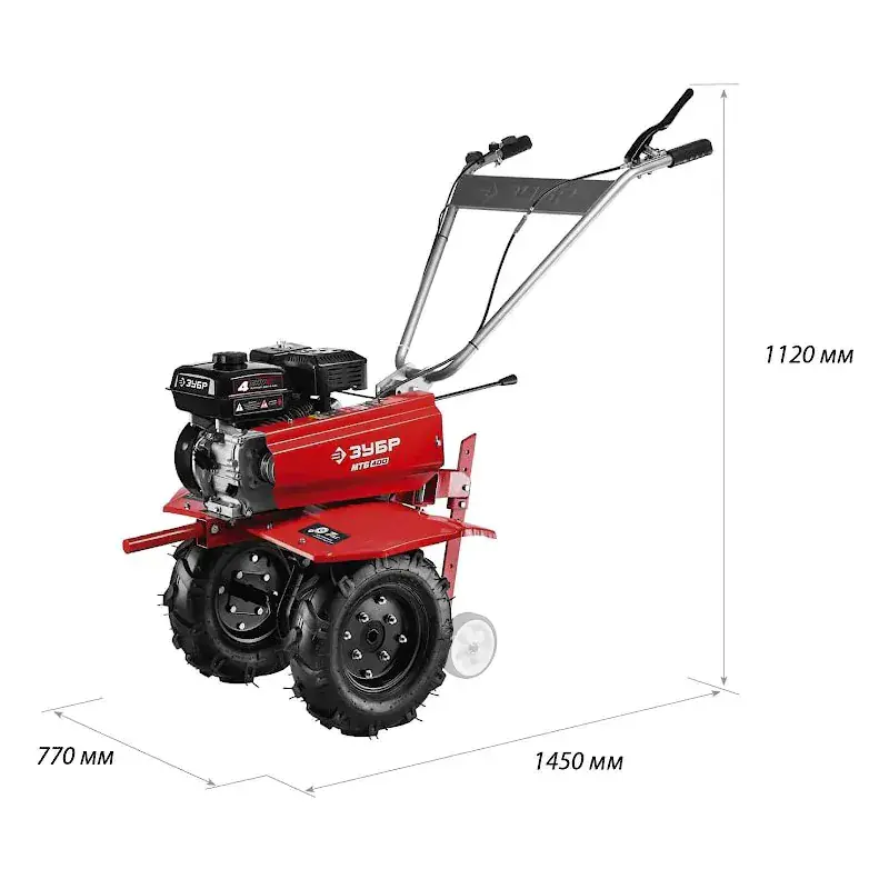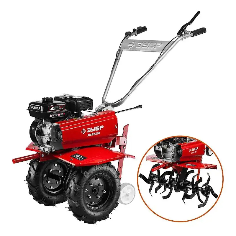 Мотоблок бензиновый Зубр МТБ-400 оснащен двигателем на 7 л.с. для эффективного вспахивания обширных территорий со сложным грунтом. Модель оснащена понижающей передачей, которая помогает справиться с вязкими и сложными грунтами, а также облегчает использование навесного оборудования.