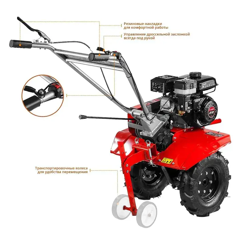 Бензиновый мотоплуг приводится в движение 4-тактным двигателем, который гарантирует высокую производительность даже под постоянными высокими нагрузками.