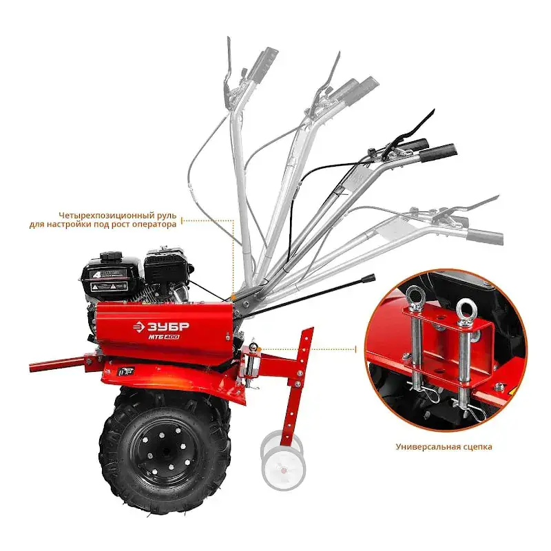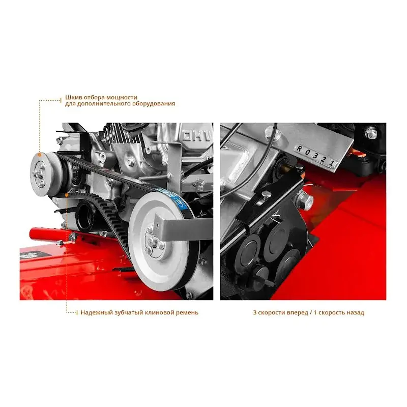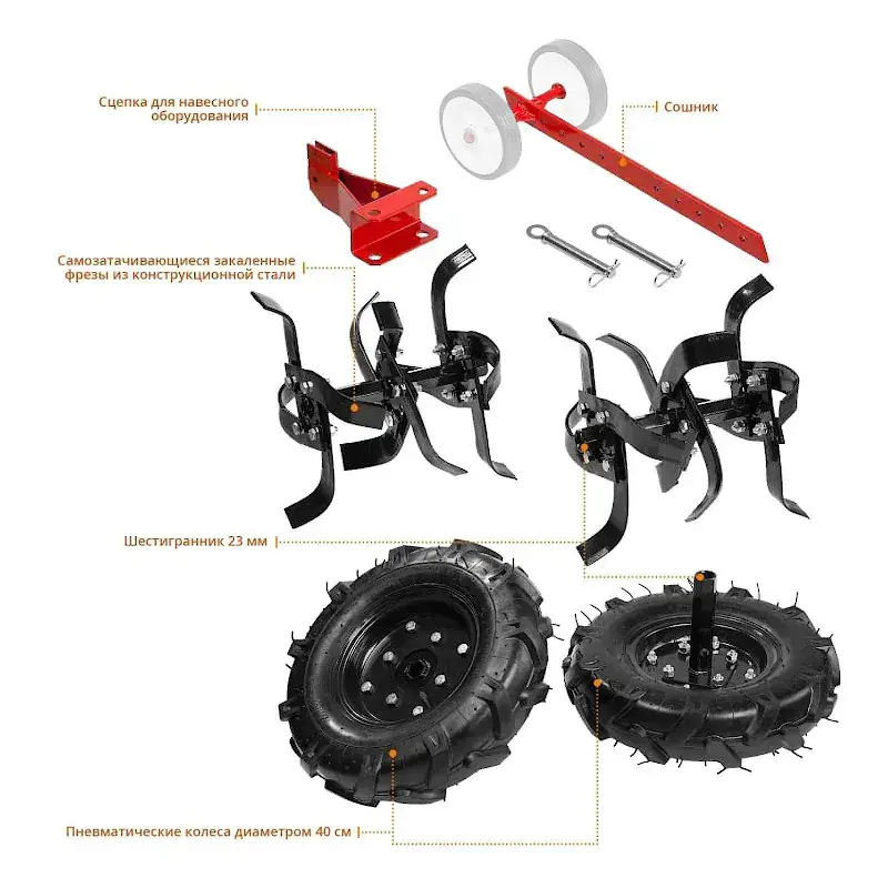 Отдельно можно приобрести плуг, снегоочиститель, щетку, лопату, фронтальную косилку, тележку и другое оборудование. Аксессуары крепятся к мотоблоку и расширяют его функционал.