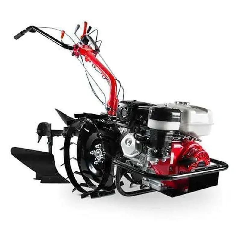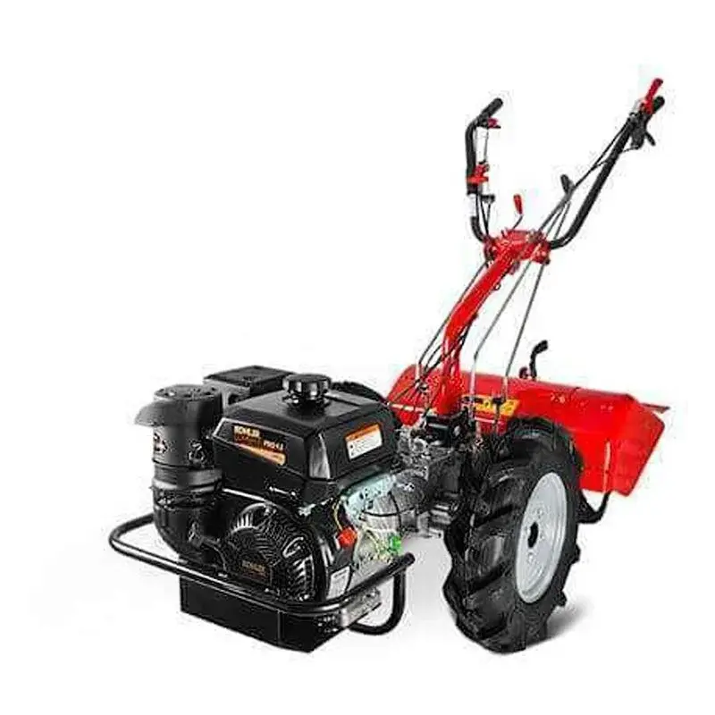 Бензиновый мотоблок Мобил К Grillo G85D с двигателем DINKING DK177F (с дифференциалом) удовлетворит потребности как начинающих фермеров, так и опытнейших профессионалов. Бесподобную производительность машины помогает показывать долговечный одноцилиндровый двигатель мощностью 9 лошадиных сил. С такой мощью можно играючи выполнить любую сложную задачу. Двигатель быстро запускается при помощи тягового троса. А за защиту мотора от перегрева отвечает система принудительного воздушного охлаждения. Для оптимальной работы в конструкции мотоблока есть надежная трансмиссия, которая разрешает легко изменять скоростной режим. Количество передач для движения вперед – 3. Максимальная скорость при этом равняется более 11 км/ч. Для движения задним ходом предусмотрено две передачи, одна из которых позволяет разогнаться до 3-х км/ч. А чтобы машина была устойчивой при любой скорости, в ее конструкции имеются большие колеса. Хорошей устойчивости способствует и вес мотоблока, равный 112 кг. Для изготовления представленной модели мотоблока используются исключительно надежные комплектующие, благодаря чему агрегат обладает высоким качеством, практичностью, функциональностью. Несмотря на «умное» техническое оснащение, машина имеет простую конструкцию и понятную систему управления. Более того, мотоблок Мобил К Grillo G85D с двигателем DINKING DK177F (с дифференциалом) может обслуживаться самим пользователем, если у него есть соответствующий опыт. Работать машиной не только просто, но и крайне комфортно. Рукоятка регулируется вправо и влево. Задний, независимый вал отбора мощности разрешает без лишний усилий надежно зафиксировать дополнительное оборудование. Шум, издаваемый мотоблоком, не слишком громкий, поэтому оператору будет комфортно работать машиной, и при этом не доставлять неудобств окружающим. Вместительный бак для топлива имеет емкость 6,5 литров, так что на одной заправке можно работать далеко ни один день. Габариты машины относительно скромные, потому будет не сложно подобрать место для ее хранения.