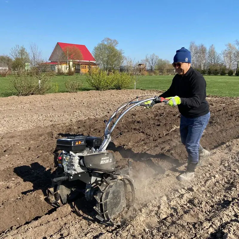 Рукоять управления настраивается в 2 плоскостях. Благодаря этому вы можете подогнать руль под свой рост, а также сдвинуть его вбок для того, чтобы не затоптать обрабатываемую землю. Рычаг сцепления культиватора Мобил К МКМ-3 ПРО сконструирован таким образом, что при нажатии на него отсутствует нагрузка на запястье. Это позволяет экономить силы при долгой работе.