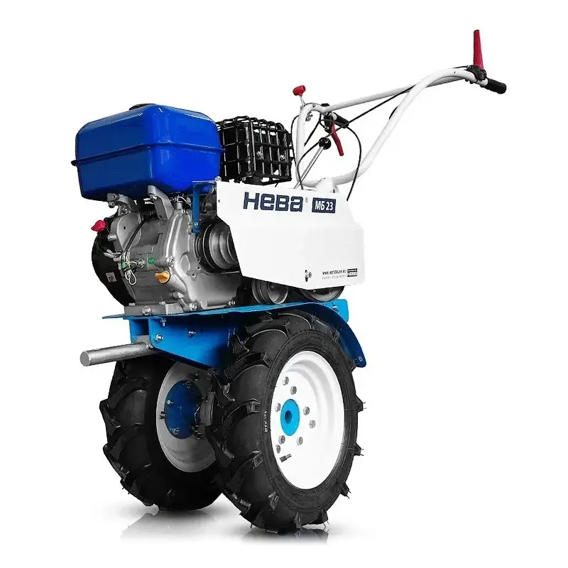 Бензиновый мотоблок Нева МБ23-ZS (GB270) весит 95 кг и способен обрабатывать почву на глубину 20 см. Возможность установки дополнительного навесного оборудования, которое приобретается отдельно, позволяет использовать модель в любой сезон года. Моторесурс двигателя составляет 1100 ч. Для удобного перемещения мотоблока по участку предусмотрены большие пневматические колеса тракторного типа.