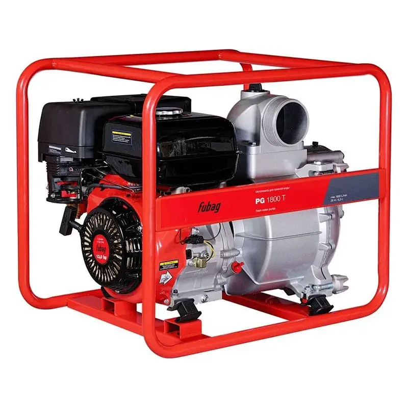 Мотопомпа для сильнозагрязненной воды Fubag PG 1800 T предназначена для откачки грязной воды из подвалов и строительных котлованов, работ в сельском хозяйстве, ликвидации последствий паводков и половодий. Мощный насос перекачивает сильнозагрязненную воду с примесями абразивных частиц до 25 мм. Максимальная высота всасывания равна 8 м, высота напора — 26 м. Производительность мотопомпы составляет 1800 л/мин.