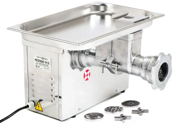 На мясорубке Торгтехмаш установлен бесшумный червячный редуктор. Он создает значительные усилия на ножах, что дает возможность перемалывать очень жёсткие продукты, включая хрящи и мелкие кости, а также позволяют агрегату работать более плавно.