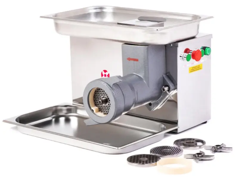 Мясорубка укомплектована полным унгером (подрезной нож, двусторонний нож, решётка крупная, двусторонний нож, решётка мелкая)