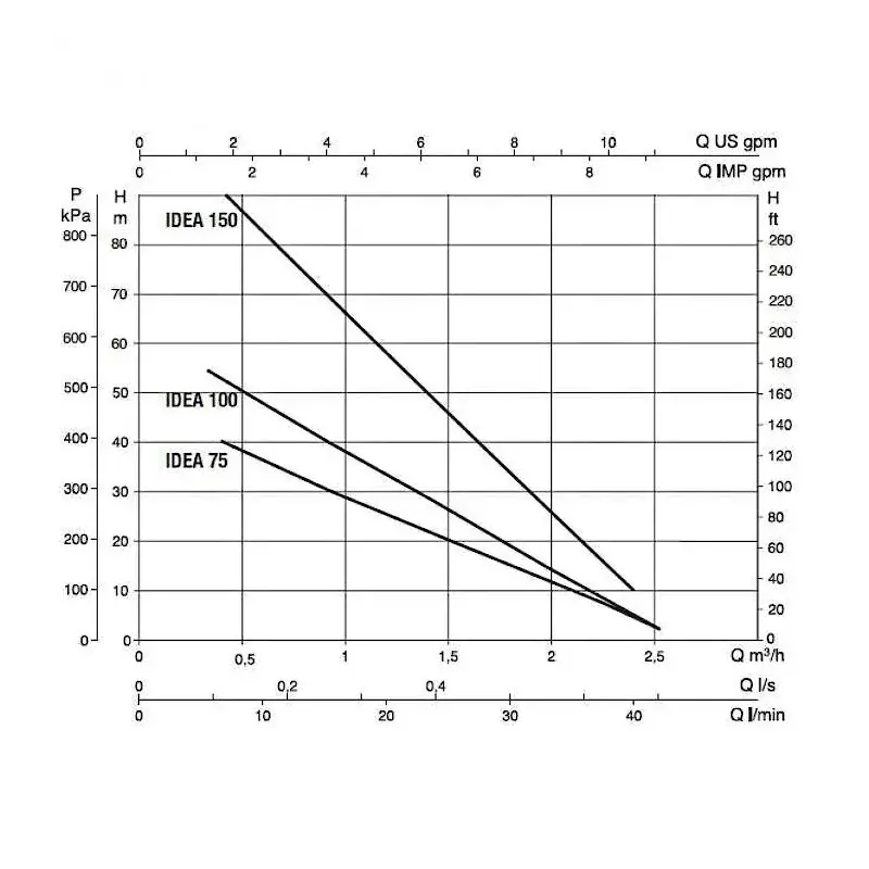 Насос IDEA 150 T разработан специально для индивидуальных и коллективных систем водоснабжения. Для скважин диаметром 4" и более. Рабочий диапазон: производительность – от 0,4 до 2,4 куб.м/ч, напор – до 52 м. водяного столба. Максимальное рабочее давление: максимальная глубина погружения – 20 м. Перекачиваемая жидкость. Состав: чистая, без твердых включений и минеральных масел, не вязкая, химически нейтральная, по характеристикам аналогичная воде. Температура: от 0°С до +35°С. Основные материалы. Гидравлический корпус и основание двигателя – из чугуна; рабочее колесо – из бронзы; кожух двигателя, вал и крепежные элементы – из нержавеющей стали. Особенности. Гидравлическая часть содержит одно рабочее колесо "вихревого" типа. Двигатели однофазных моделей оборудованы встроенным конденсатором. Для трехфазных двигателей требуется внешняя защита от перегрузки. Монтаж. Вал двигателя – в вертикальном положении. Комплект поставки: насос в сборе с кабелем длиной 15 м и нейлоновым тросом длиной 15 м. Стандартное электропитание: 1x230 В, 3x400 В. Степень защиты: IP 68. Класс изоляции: F.
