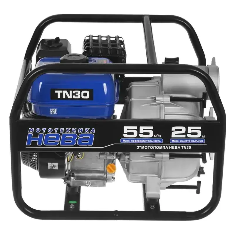 Бензиновая мотопомпа НЕВА TN30 с производительностью 916 л/мин или 55 м3/ч предназначена для бытовых нужд. Диаметр всасывающего и нагнетательного патрубков составляет 80 мм или 3 дюйма. Прибор забирает воду с глубины до 6 м, поэтому позволяет обслуживать колодцы и коллекторы. Мотонасос с напором 25 м обеспечивает подачу воды на расстояние до 250 м по горизонтали.