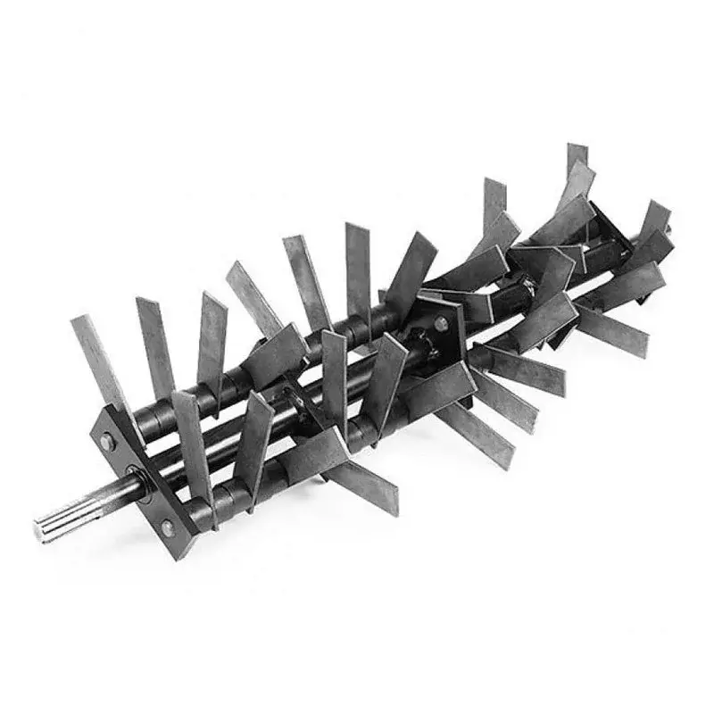 - Рабочий орган с четырьмя рядами свободно подвешенных ударных ножей (52 шт.) из закаленной стали. Используя центробежную силу, они эффективно удаляют мох и сухой травы с поверхности газона. Эта конструкция обеспечивает превосходное удаление сухой травы и подтверждает свою надежность почти четыре десятилетия в сложных условиях прокатного использовании