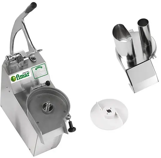 Овощерезка Fimar TV3000 (220V) 5 ножей предназначена для нарезки фруктов и овощей на кусочки различных форм и размеров, натирания сыра, сухарей, шоколада, фундука, шинкования моркови, сельдерея, картофеля, яблок, репы, свеклы, мягкого сыра моцарелла.