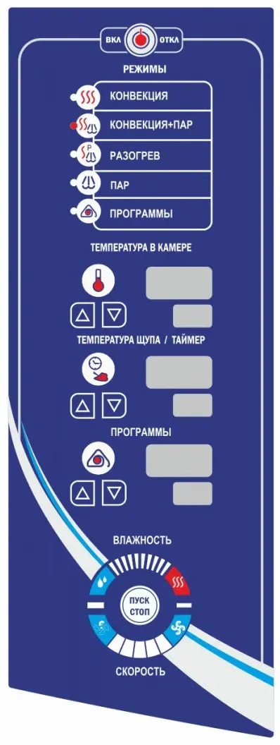 Мембранная панель управления: Удобная панель управления на русском языке легка и удобна в обслуживанииРеверс вентилятора: Функция реверса вентилятора необходима для равномерной циркуляции воздуха внутри рабочей камеры ПКА и для оптимального распределения тепла от нагревательных элементов: