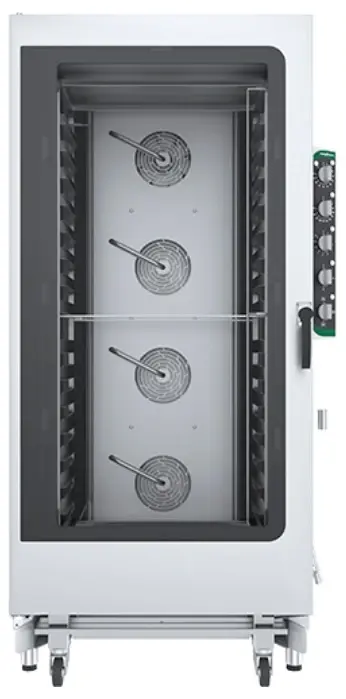 Пароконвектомат состоит из жарочной камеры, установленной в корпусе, дверей и панели управления. На задней стенке камеры пароконвектомата установлены электродвигатели и трубчатые электронагреватели, четыре электродвигателя и четыре ТЭНа. Для достижения экономичного расхода электроэнергии и безопасности, жарочная камера изолированная слоем теплоизоляции.