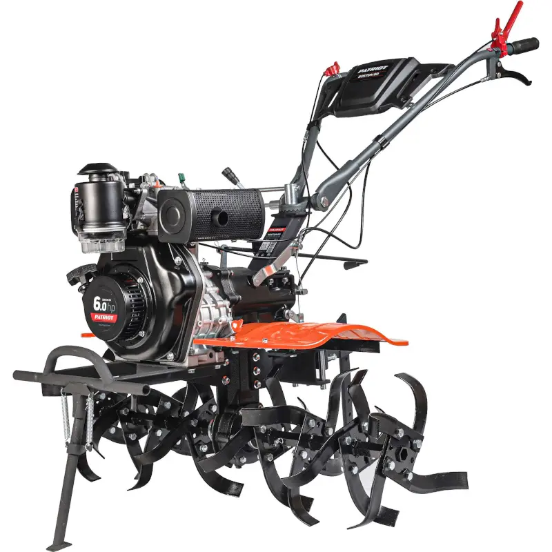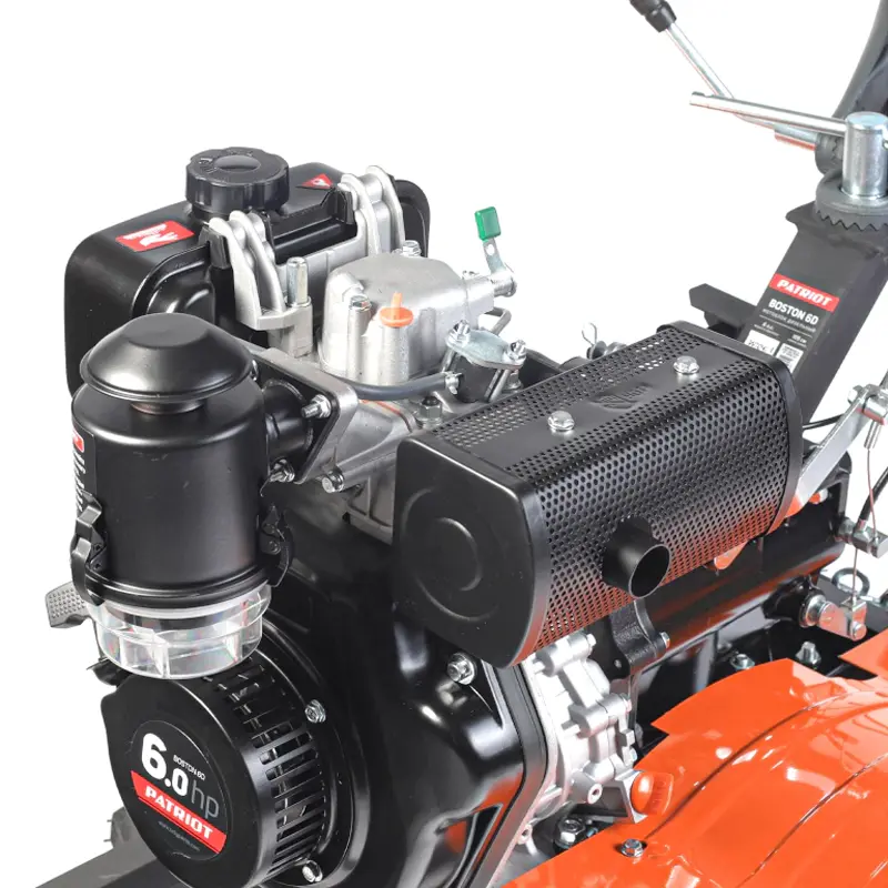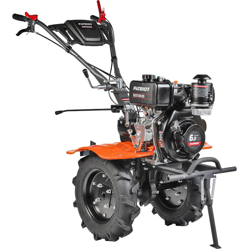 Дизельный мотоблок Patriot Boston-6D обеспечивает ширину обработки в 105 см и поставляется в комплекте с фрезами, которые способны вспахать даже целину. Для облегченной работы предусмотрено несколько скоростей движения, большие колеса тракторного типа и возможность установки навесного оборудования: от картофелевыкапывателя и плуга до грузовой тележки.