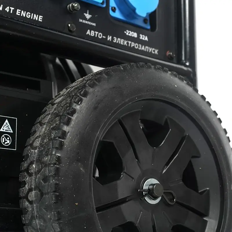 Прочная стальная рама надежно защищает двигатель и электронику от механических повреждений. А благодаря наличию специальных демпферов, которые гасят вибрацию при работе, мотор и внутренние узлы аппарата будут меньше изнашиваться. У генератора имеются колеса для транспортировки. Это помогает без труда перевозить аппарат с места на место.