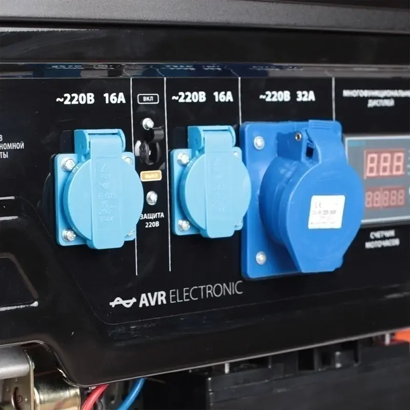 Для подключения разнообразной техники на корпусе есть несколько евророзеток: две на 16 А и одна на 32 А. Дополнительно предусмотрен выход на 12 В для подзарядки автомобильных аккумуляторов. К генератору можно подключать как бытовые приборы, так и мощную технику для работы на производстве, например сварочные аппараты или небольшие станки.