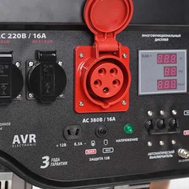 Бензиновый генератор рассчитан на использование в качестве автономного источника электроэнергии для питания трехфазного оборудования и электроинструмента. Оптимальное соотношение мощности двигателя и электрогенератора обеспечивает стабильную работу на номинальной мощности. Оснащен двигателем с верхним расположением клапанов [OHV], что значительно увеличивает ресурс, снижает выхлоп и уровень шума. Датчик контроля масла исключает запуск и работу генератора при отсутствии или низком уровне масла в картере. Синхронный электрогенератор с системой автоматической регулировки и медными обмотками обеспечивает стабильное выходное напряжение и частоту тока. Цифровой электронный мультидисплей позволяет контролировать все выходные характеристики: напряжение, мощность, ток, частоту, а счетчик моточасов помогает следить за интервалами между техническим обслуживанием. Выход 12 вольт позволяет подзарядить автомобильный аккумулятор в экстренном случае.