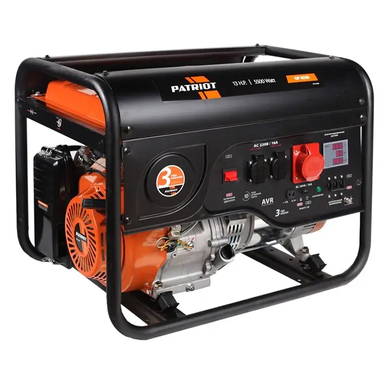 Бензиновый генератор рассчитан на использование в качестве автономного источника электроэнергии для питания трехфазного оборудования и электроинструмента. Оптимальное соотношение мощности двигателя и электрогенератора обеспечивает стабильную работу на номинальной мощности. Оснащен двигателем с верхним расположением клапанов [OHV], что значительно увеличивает ресурс, снижает выхлоп и уровень шума. Датчик контроля масла исключает запуск и работу генератора при отсутствии или низком уровне масла в картере. Синхронный электрогенератор с системой автоматической регулировки и медными обмотками обеспечивает стабильное выходное напряжение и частоту тока. Цифровой электронный мультидисплей позволяет контролировать все выходные характеристики: напряжение, мощность, ток, частоту, а счетчик моточасов помогает следить за интервалами между техническим обслуживанием. Выход 12 вольт позволяет подзарядить автомобильный аккумулятор в экстренном случае.