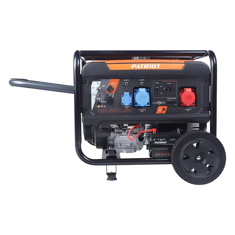 Бензиновый генератор PATRIOT GRA 8500DAW используется для резервного электроснабжения осветительных и бытовых приборов в коттедже или на даче, небольших станков и инструментов в мастерской. Номинальная мощность на выходе при выработке однофазного тока составляет 7,5 кВт, при выработке трехфазного — 8 кВт. Генератор имеет три розетки: бытовую 230 В/16 А и силовые 230 В/32 А, 400 В/16 А, а также выход постоянного тока 12 В.