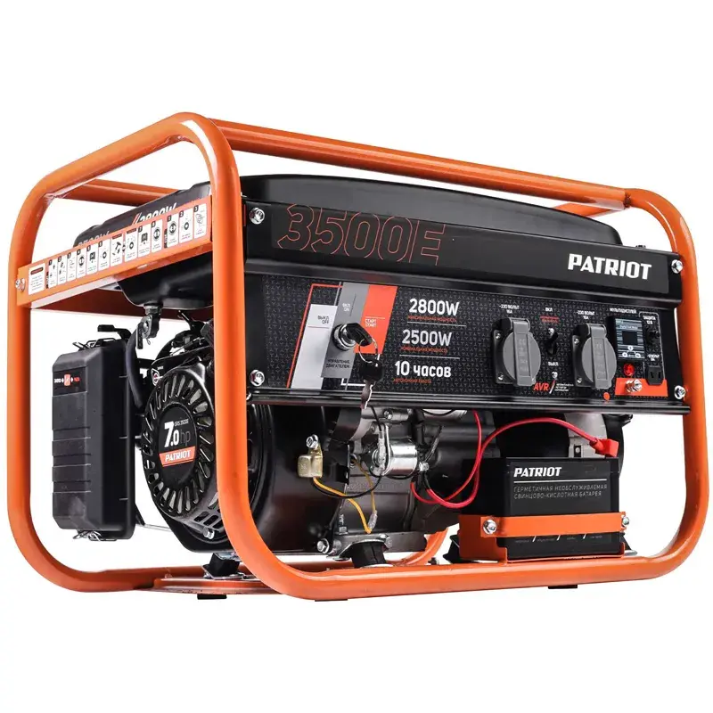 Бензиновый генератор PATRIOT GRS 3500 E имеет усиленную переднюю панель с утопленными элементами управления, что снижает риск механических повреждений. Он также оснащен дисплеем, индикатором уровня топлива, защитой от перегрузок, вольтметром и счетчиком моточасов. Аккумулятор в комплекте позволяет использовать электростартер без подключения к сети.