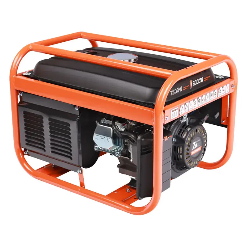 Бензиновый генератор открытого типа оснащен защитной рамой. Она представляет собой металлическую трубу, которая огибает весь корпус. Рама используется не только для защиты от механических повреждений, но и в качестве устойчивой опоры и держателей для переноски модели.