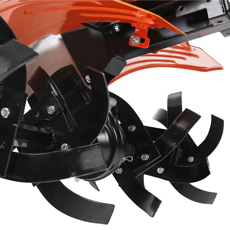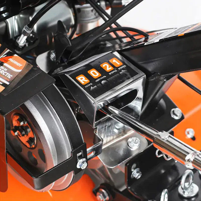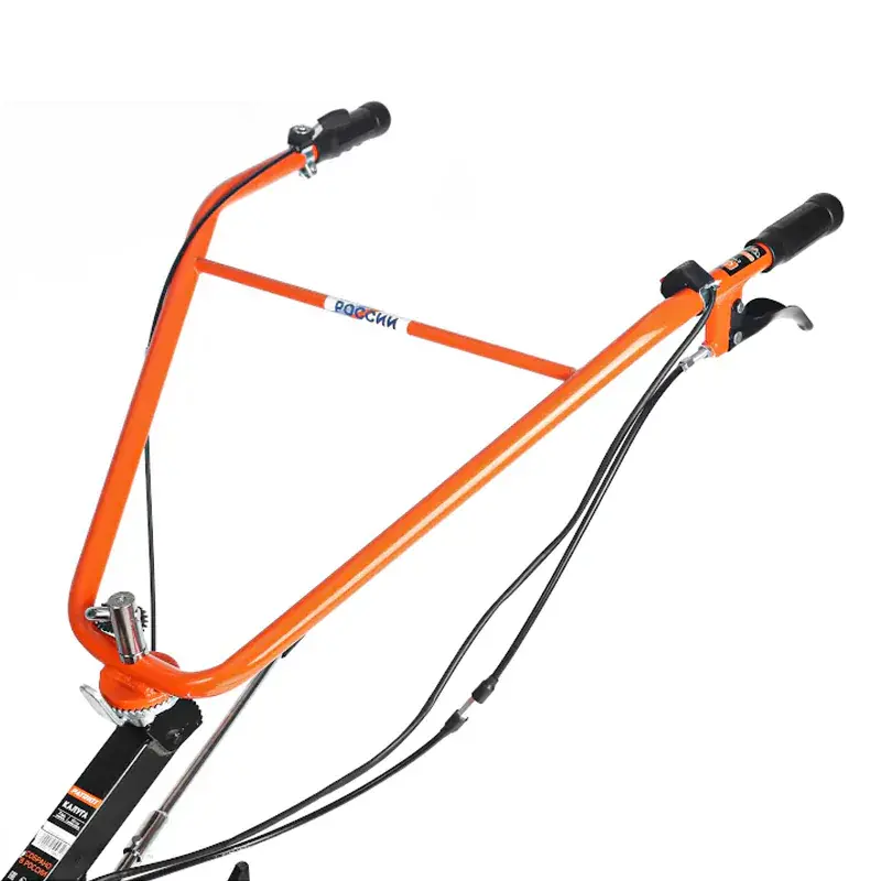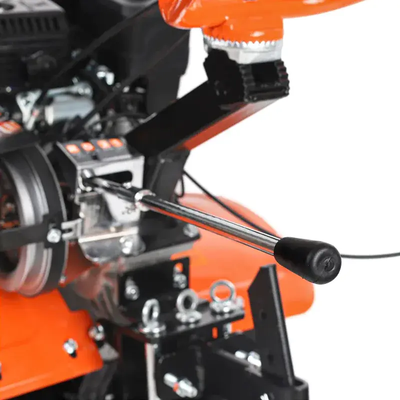 Бензиновый мотоблок оснащен рулем, на котором расположены все основные элементы управления: сцепление и регулировка оборотов двигателя. Длинный рычаг переключения передач избавляет от необходимости наклоняться для выбора нужной скорости. Задний ход повышает маневренность машины и упрощает ее извлечение в случае увязывания в почве. Глубину вспашки легко регулировать путем перемещения сошника вверх-вниз и фиксации его на нужном уровне. Пониженная скорость обеспечивает безопасность работы благодаря плавному началу движения без рывков. В этом режиме удобно работать с сеялкой и другим навесным оборудованием, требующим медленного перемещения.