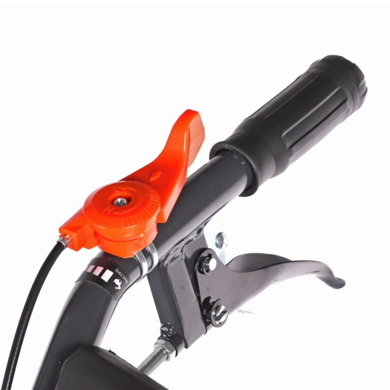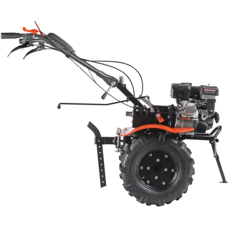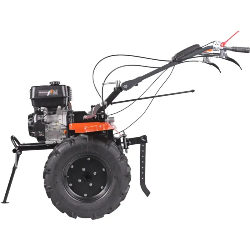Крепкие ручки и усиленная рама делают мотоблок подходящим для тяжелых задач. Руль оснащен кнопкой включения, рукояткой газа, рычагами привода и кейсом для инструментов, его наклон регулируется. Металлическая подножка с ручкой упрощает установку фрез. Мотоблок перемещается на колесах типа P5,00-12D-1 с рельефным протектором, обеспечивающим надежное сцепление с грунтом.