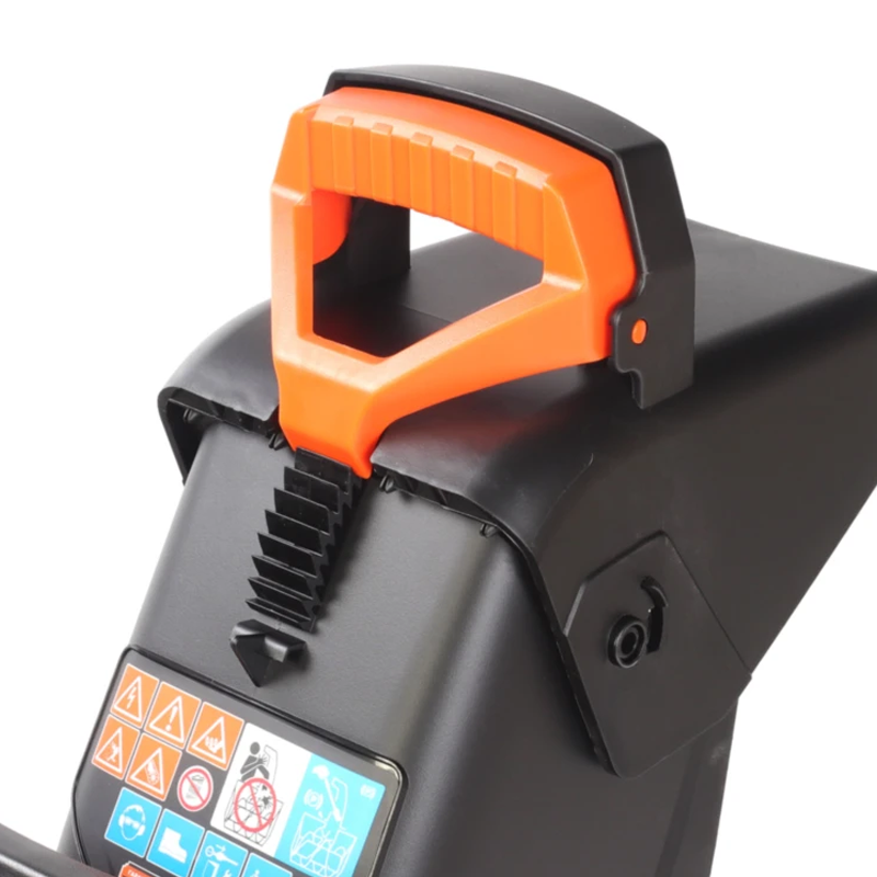 Одноступенчатый резино-металлический шнек (диаметр 17 см) и удобный ковш (ширина 50 см). В передней части снегоуборщика расположены две светодиодные фары. Колеса диаметром 19 см эффективны для эксплуатации на ровных поверхностях. Небольшие габариты и малый вес (23 кг). Дальность выброса снега до 6 метров.