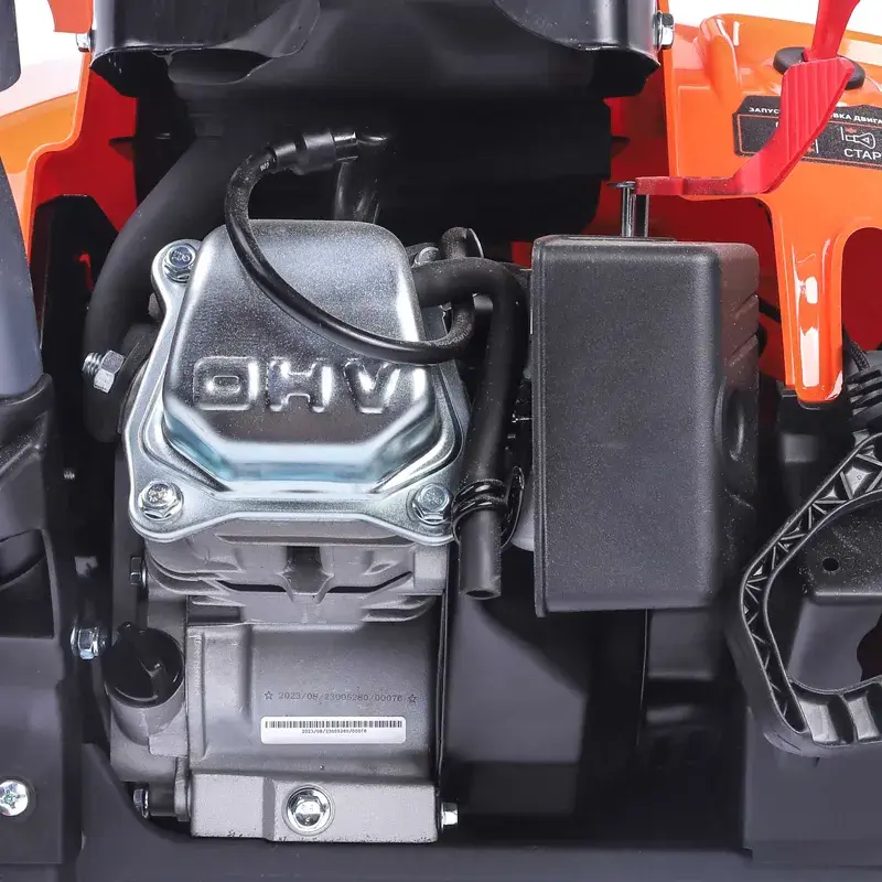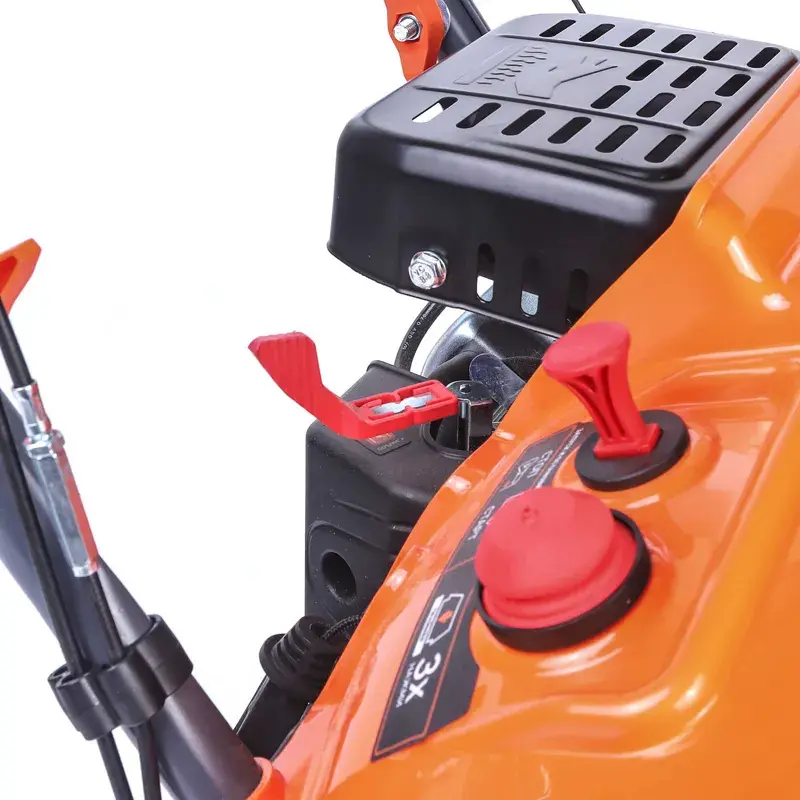 Бензиновый снегоуборщик имеет простые элементы управления. Чтобы включить вращение шнека, достаточно прижать рычаг к рукоятке. Разгрузочный желоб поворачивается на ходу при помощи длинной ручки, без остановки машины. Для повышения эффективности уборки угол поворота и дальность выброса можно регулировать. Машину легко толкать благодаря особой системе сцепления шнека с очищаемой поверхностью, за счет чего образуется дополнительная тяга.
