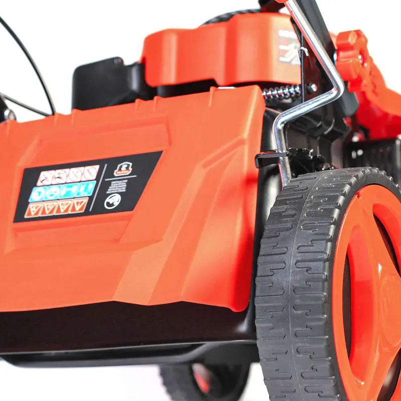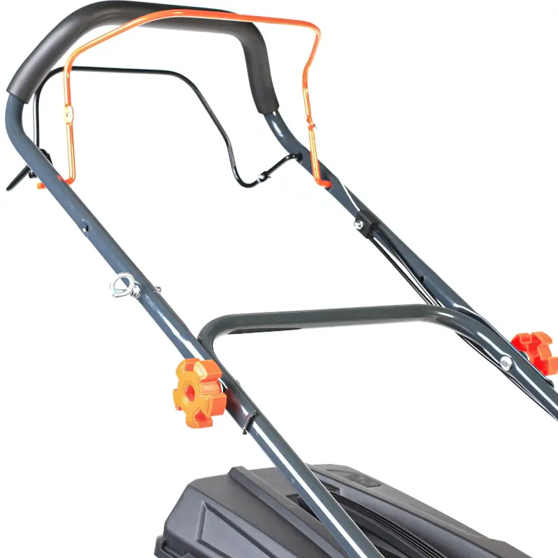 На корпусе есть 7-режимный рычаг, изменяющий высоту режущих лезвий. Регуляция уровня деки позволит убирать нужное вам количество травы, в зависимости от типа рельефа местности или цели вашей работы.