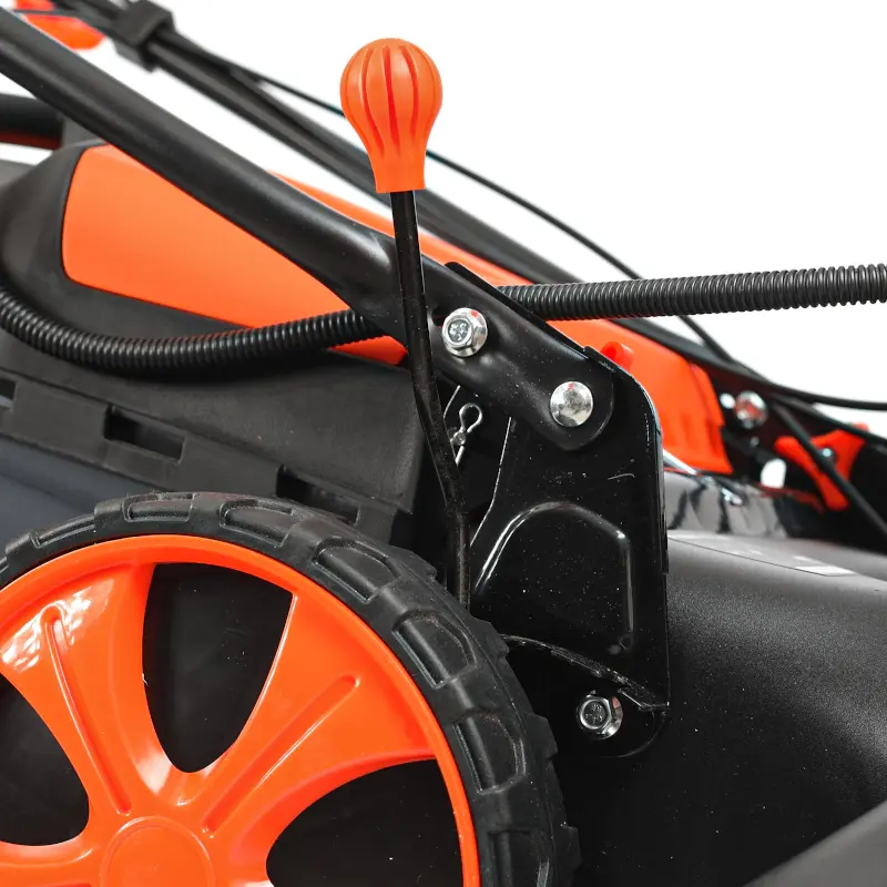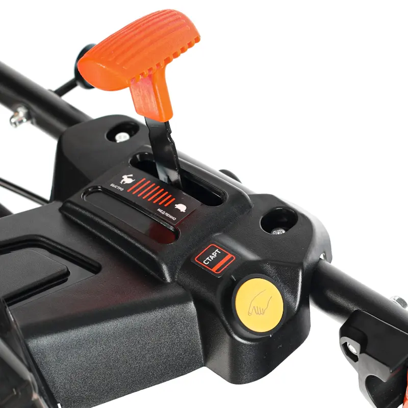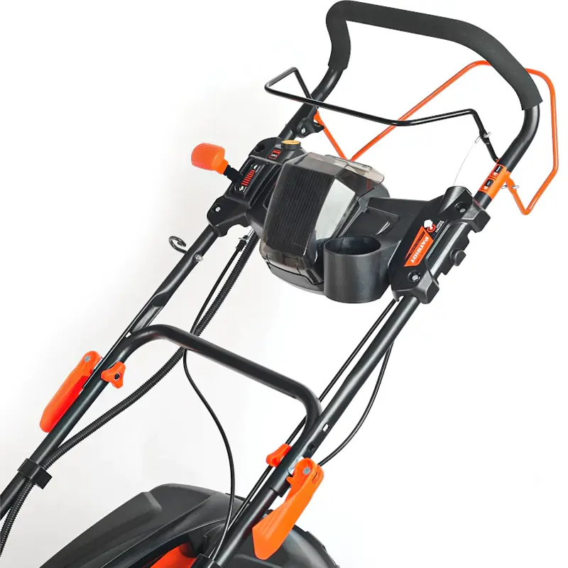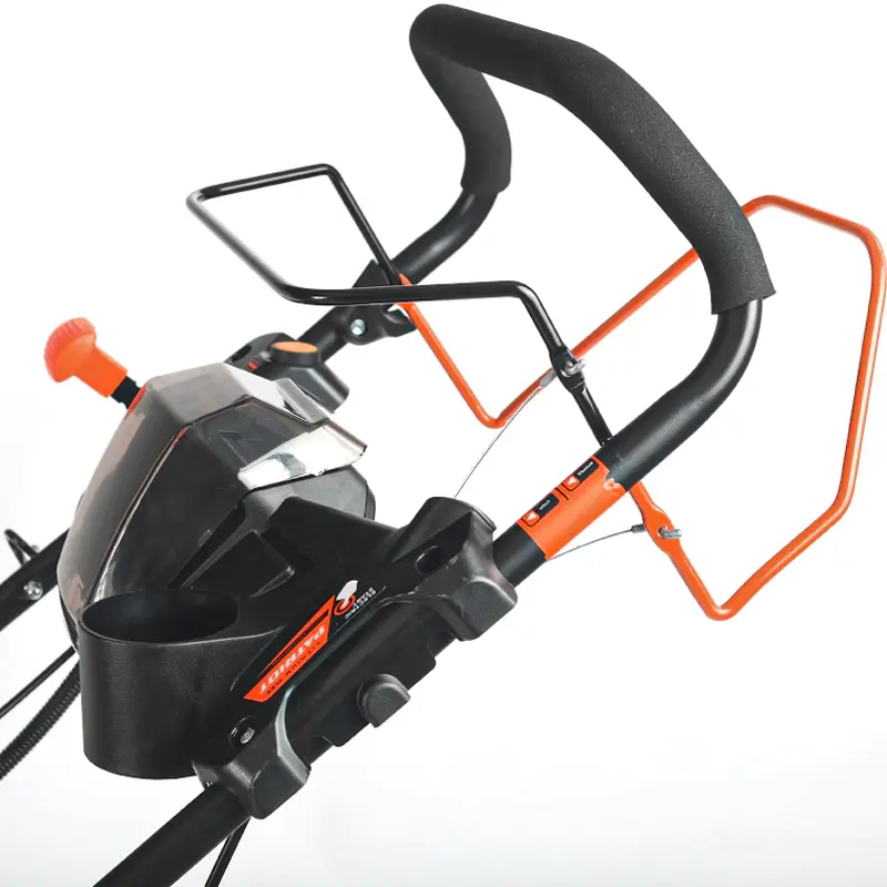 Рукоятка с мягким покрытием быстро разбирается с помощью боковых вращающихся ручек на раме. Это приводит к компактному хранению или перевозке косилки.