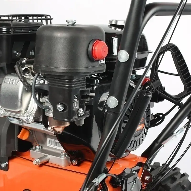Двигатель самоходного снегоуборщика Patriot Сибирь 85 ЕТ запускается двумя способами, от ручного стартера или электрозапуска. В первом случае понадобится вытягивать тросик, прикладывая усилия. Но такой способ позволит запустить даже холодный двигатель. При использовании электростартера на включение модели у вас уйдет не более 3 с.