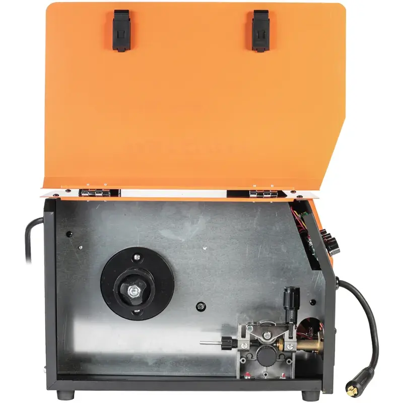 Шланг длиной 3 м обеспечивает достаточную маневренность при выполнении операций. Держатель проволоки позволяет устанавливать в отсек катушки весом до 5 кг. Этого достаточно для длительной работы. Туннельное охлаждения способствует эффективному отведению тепла от внутренних элементов устройства и защищает его от перегрева.