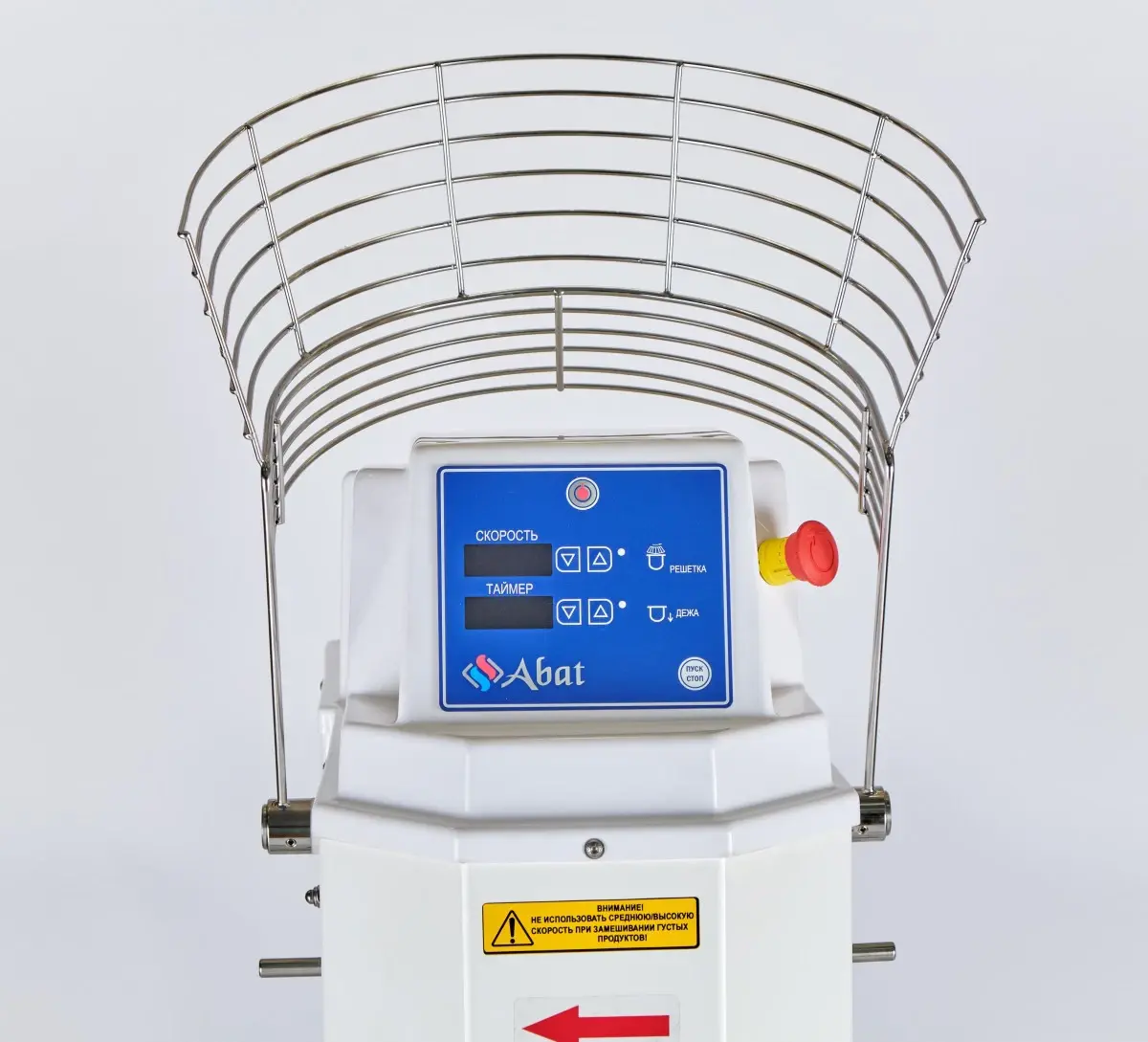 Откидная защитная решетка, защищающая персонал от вращающихся рабочих частей машины и позволяющая добавлять ингредиенты в дежу, не прерывая процесс замеса (при поднятии защитной решетки работа тестомеса автоматически прекращается).