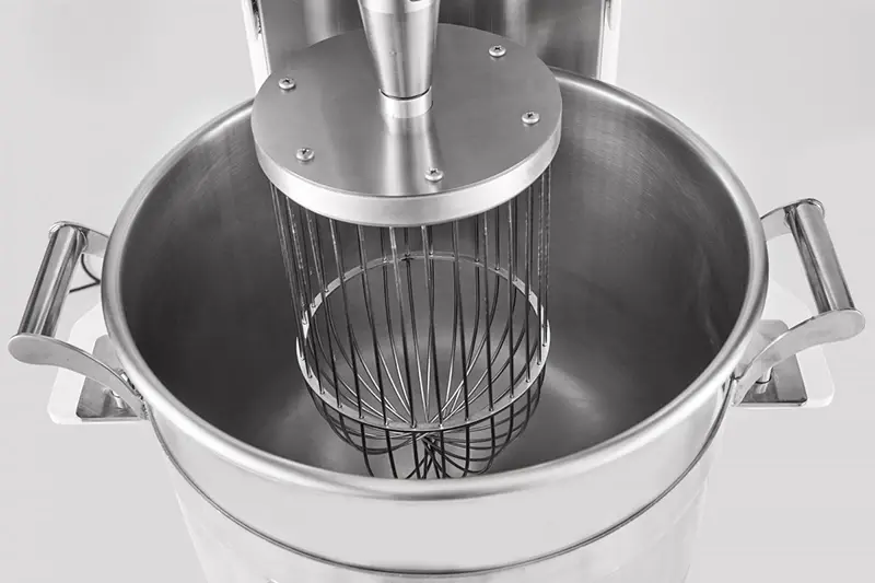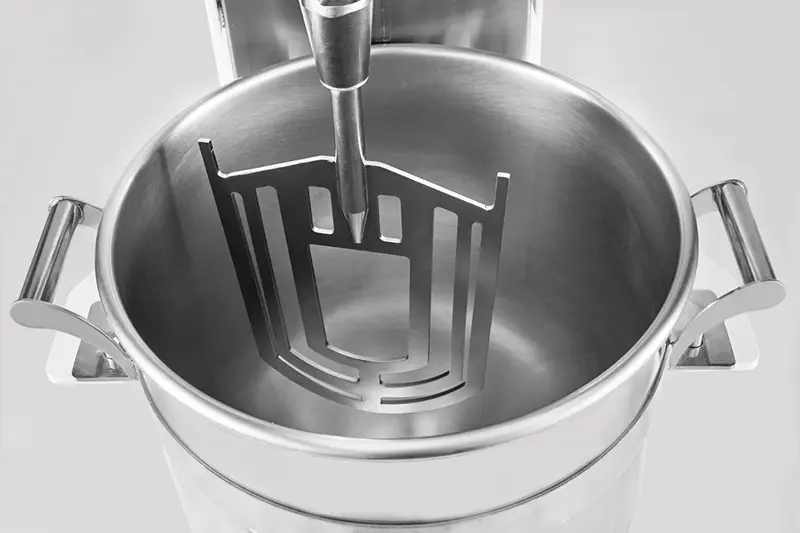 Объемная чаша на 40 л позволяет приготовить блюда на большое количество человек одновременно. Чаша и все насадки выполнены из аустенитной нержавеющей стали AISI 304, что обеспечивает долгую и надежную эксплуатацию на радость всем кулинарам.