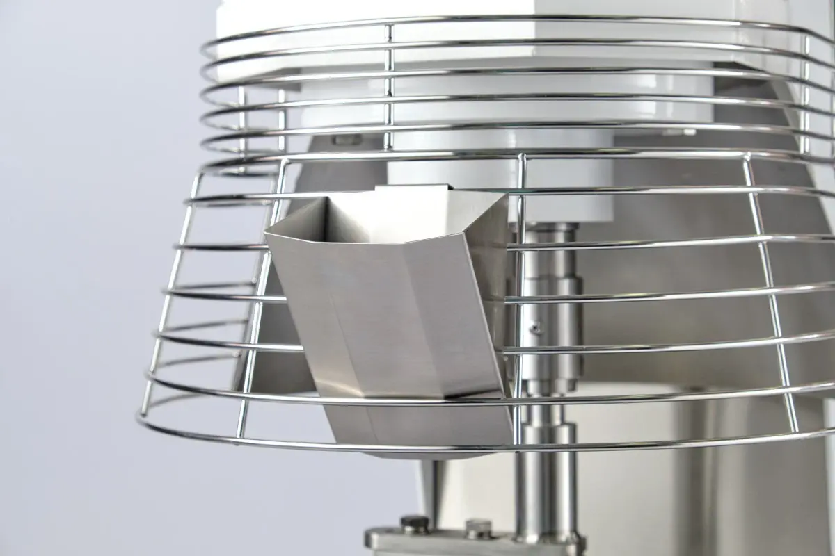 Откидная защитная решетка, защищающая персонал от вращающихся рабочих частей машины и позволяющая добавлять ингредиенты в дежу, не прерывая процесс замеса (при поднятии защитной решетки работа тестомеса автоматически прекращается).