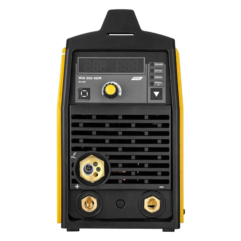 Аппарат полуавтоматической сварки ПТК RILON MIG 200 GDM, помимо классической ручной сварки электродом диаметром 1,5–5,0 мм, поддерживает три режима работы в среде защитной газовой смеси, позволяющих сваривать детали из стали, алюминия и сплавов. Синергетическая функция значительно упрощает управление сварочным процессом. За счет применения инверторной технологии КПД достигает 80 %, а продолжительность включения — 60%. Устройство работает от однофазной электросети 220 В.