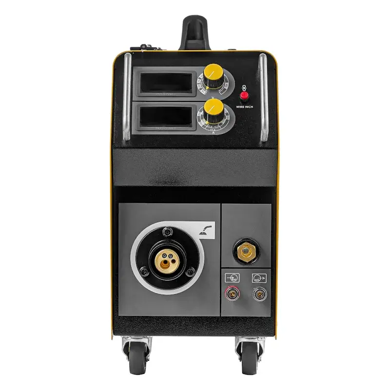 - На передней панели аппарата находится многофункциональный дисплей с возможностью регулировок силы сварочного тока, сварочного напряжения, индуктивности, регулировки скорости подачи проволоки и других параметров сварочного процесса.