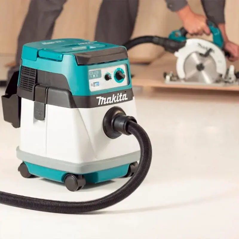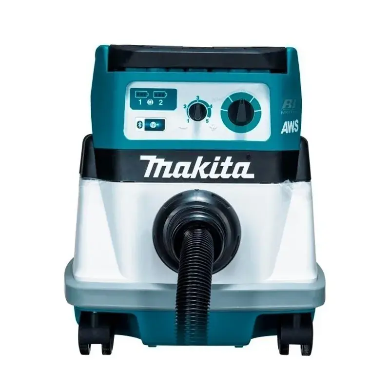 Технология AWS обеспечивает подключение электроинструмента по Bluetooth. Принцип действия прост – при запуске пилы, болгарки, перфоратора и другой техники с системой пылеотвода, автоматически включается и пылесос. Стружка и пыль поступают по патрубку электроинструмента и по шлангу попадают в емкость для сбора мусора. Включение и выключение двигателя строительного пылесоса Makita DVC154LZ происходит автоматически. Технология упрощает работу и позволяет работать без вспомогательных проводов.
