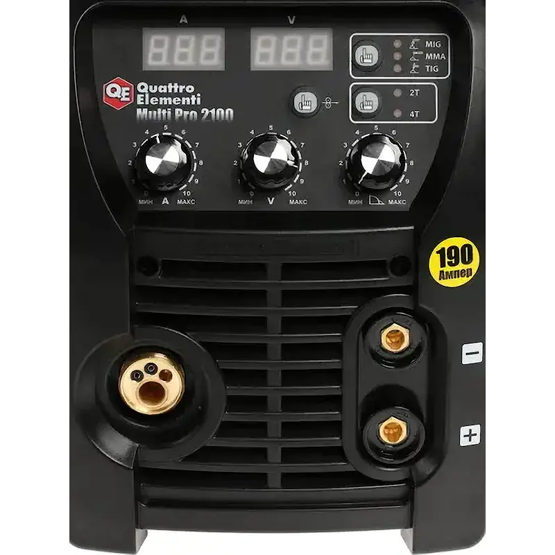 Сварочный полуавтомат QUATTRO ELEMENTI Multi Pro 2100 с диапазоном сварочного тока от 10 до 190 А предназначен для работы в режимах MMA, TIG, а также MIG/MAG. Модель позволяет гибко настраивать параметры сварки, совместима с еврокатушками весом до 5 кг и имеет встроенный механизм для протяжки проволоки.