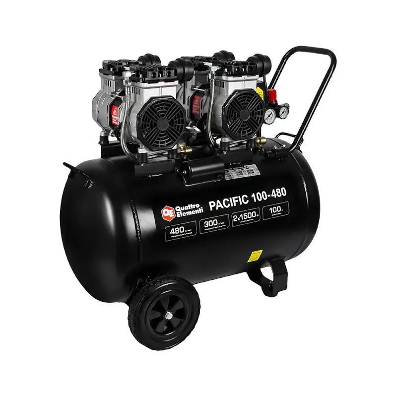 Поршневой безмасляный компрессор QUATTRO ELEMENTI PACIFIC 100-480 характеризуется внушительной производительностью 480 л/мин на входе и 300 л/мин на выходе. Оборудован объемным ресивером на 100 л, который обеспечивает непрерывную работу на протяжении длительного времени. Для простого перемещения по помещению предусмотрены большие транспортировочные колеса и высокая ручка.