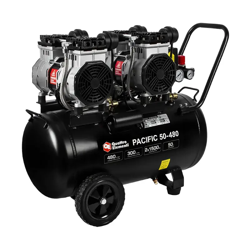 Поршневой безмасляный компрессор QUATTRO ELEMENTI PACIFIC 50-400 отличается производительностью 400 л/мин на входе и 250 л/мин на выходе. Благодаря небольшому ресиверу 50 л не занимает много пространства во время хранения. Легко перемещается за счет двух транспортировочных колес и высокой рукоятки.