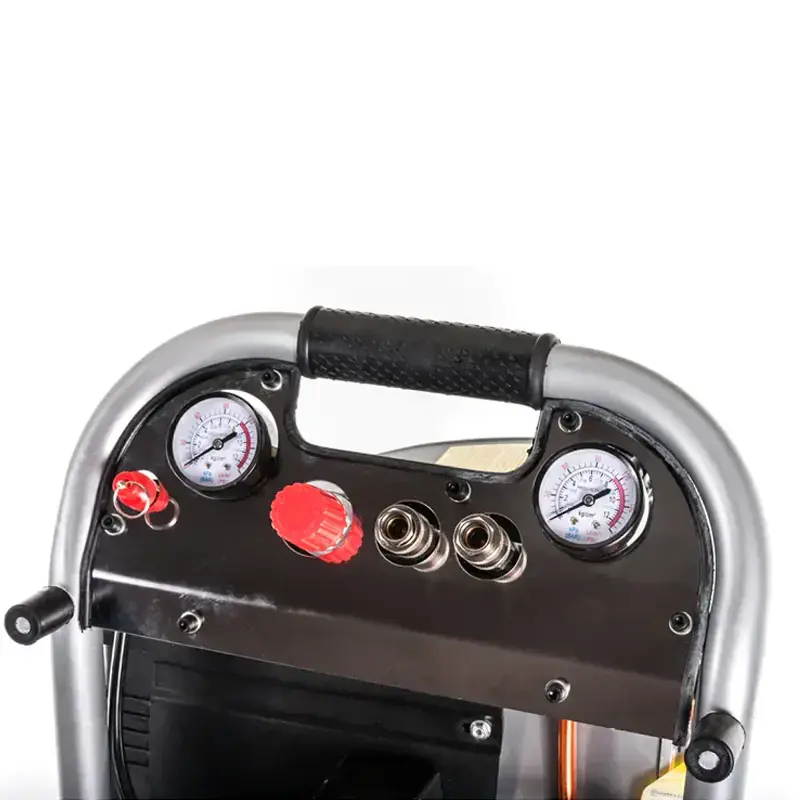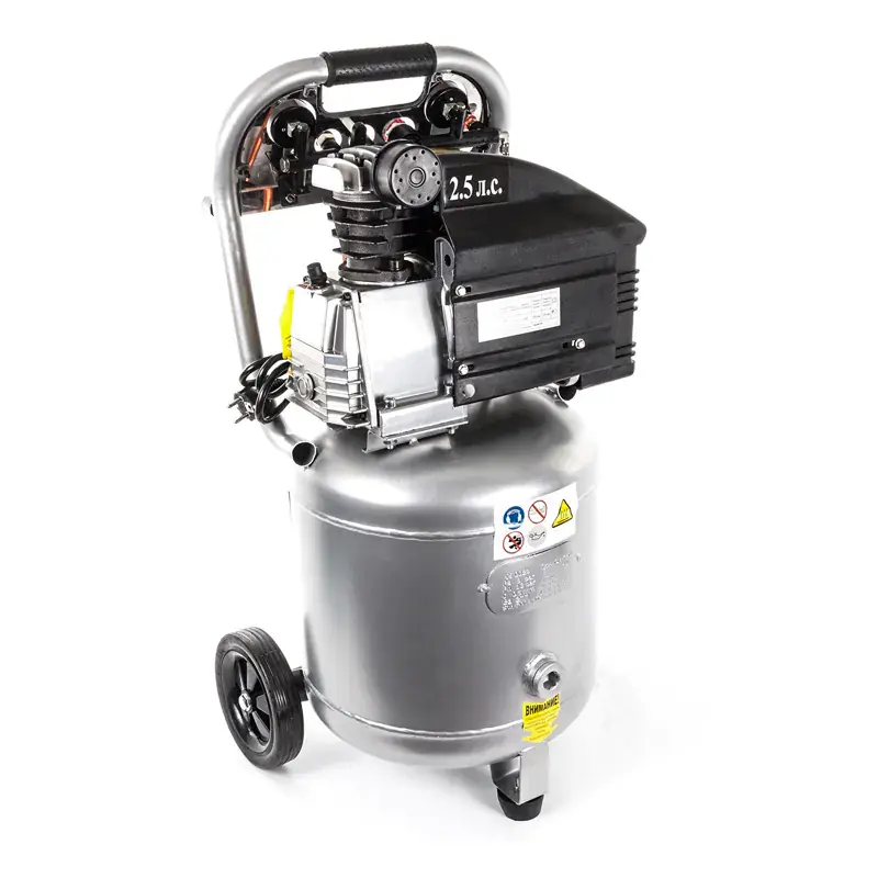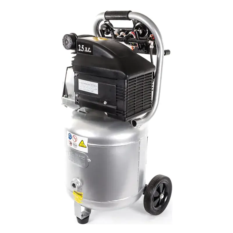 Регулятор давления позволяет установить точное значение, необходимое для работы пневматического оборудования. Аппарат легко передвигать с одного места на другое благодаря колесам и ручке.