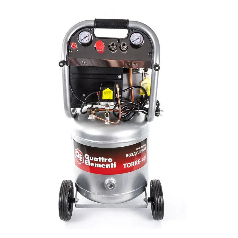 Компактный масляный компрессор QUATTRO ELEMENTI TORRE-40 оснащен колесами, ручкой и удобно расположенной приборной панелью. Благодаря вертикальному исполнению аппарат занимает совсем мало места, поэтому подходит для использования в небольших мастерских или гаражах. Модель с потребляемой мощностью 1850 Вт подключается к бытовой сети 220 В. Максимальное рабочее давление составляет 8 бар, производительность на выходе — 170 л/мин.