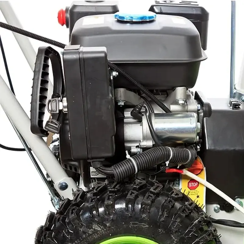 Снегоуборщик оснащен колесами с глубоким протектором, они упрощают перемещение и предотвращают пробуксовку на обледенелых участках.