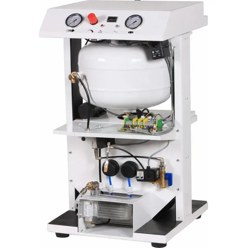 Компрессор безмасляный с прямым приводом, позволяет получить качественный воздух на выходе без примесей масла. Предназначен для обеспечения сжатым воздухом стоматологического, медицинского, лабораторного оборудования и инструмента. Компрессор оснащен двигателем 1,1 кВт, напряжением 220В, производительностью на входе 200л/мин. Компрессор укомплектован ресивером 24л. Компрессор имеет опорные ножки, которые гарантируют устойчивое положение. Контроль за давлением сжатого воздуха осуществляется с помощью автоматического реле давления,редуктора и манометров. Исполнение в шумозащищенном корпусе.Ресивер изнутри окрашен защитной порошковой полимерной краской.
