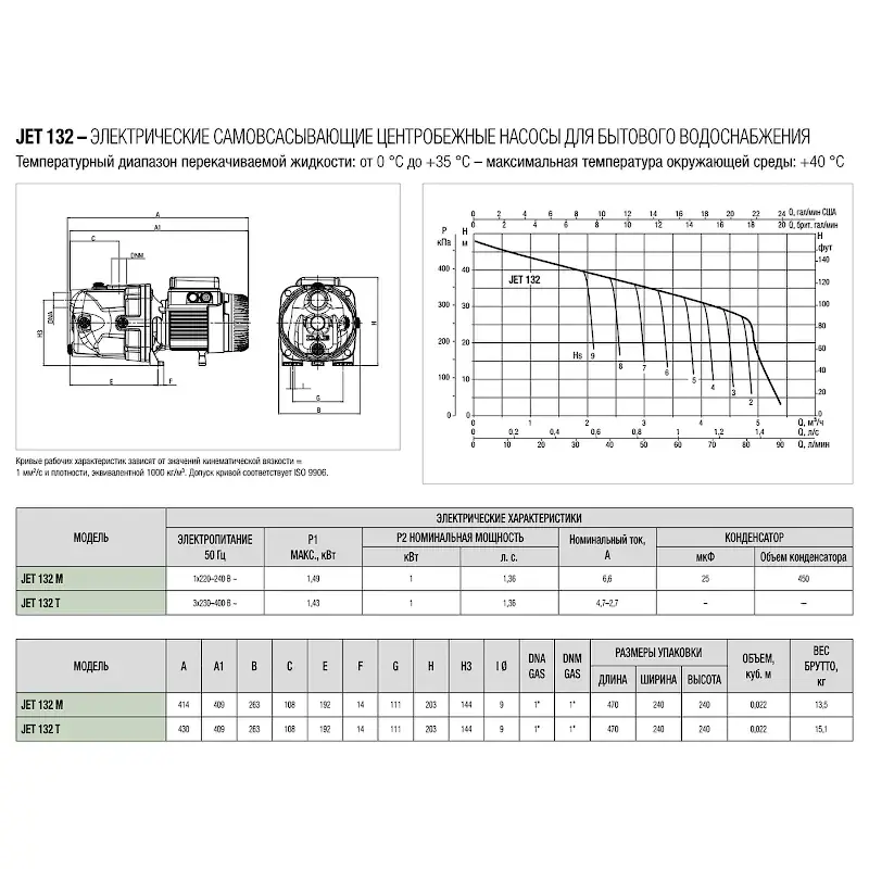 DAB JET 132 M - самовсасывающий центробежный насос с хорошей всасывающей способностью, который может перекачивать воду даже при наличии в ней пузырьков воздуха и небольшого количества песка. Предназначен для применения в бытовых системах водоснабжения, для подачи воды из скважин, колодцев и емкостей, для подпора, в качестве насоса для сада и огорода и везде, где требуются самовсасывающие возможности насоса с глубины до 8 метров.